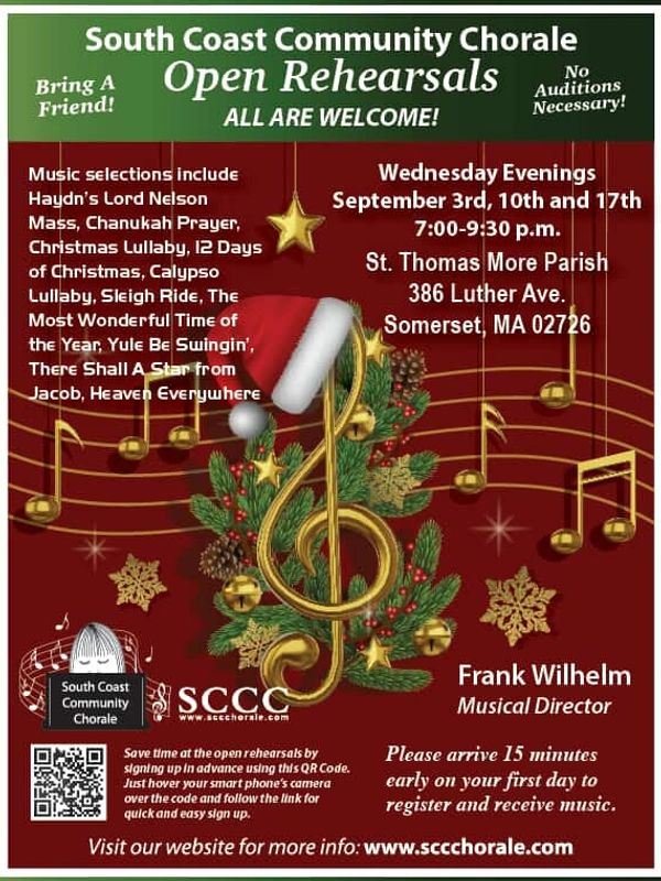 SCCC will be hosting an open enrollment period on Wednesday’s, September 3rd, 10th and 17th, from 7:00 pm - 9:30 pm at St. Thomas More Parish, 386 Luther Ave, Somerset, MA. Classical music selection will include Haydn's Lord Nelson Mass! Our other musical selections will include Chanukah Prayer, Christmas Lullaby, 12 Day of Christmas, Calypso Lullaby and many more Holiday Favorites.